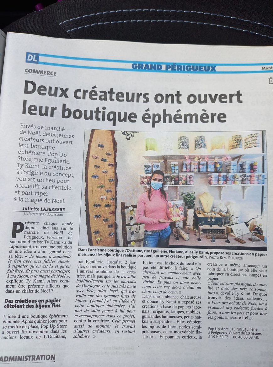 Après de belles rencontres périgourdines, en voici une nouvelle pour Ty Kami et JUERI. Mille mercis à la DL Dordogne Libre pour ce bel article. Retrouvez-nous tous les jours au Pop-up Store, 18 rue Eguillerie à Périgueux. Nous serons heureux de vous transmettre nos passions ainsi que nos coups de cœur !