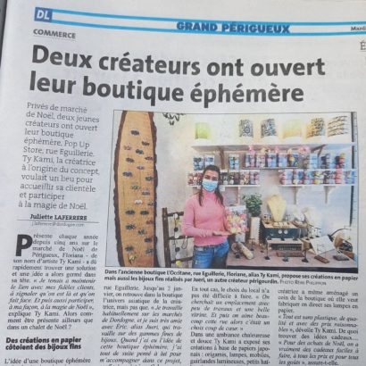 Après de belles rencontres périgourdines, en voici une nouvelle pour Ty Kami et JUERI. Mille mercis à la DL Dordogne Libre pour ce bel article. Retrouvez-nous tous les jours au Pop-up Store, 18 rue Eguillerie à Périgueux. Nous…